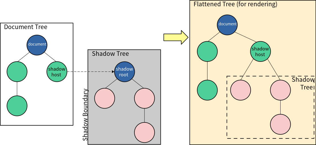 shadowDOM mdn ๋ฌธ์์์ ๋ณผ ์ ์๋ shadowDOM ๊ตฌ์กฐ์ด๋ค. ์ผ๋ฐ DOM์ ์ฐ๊ฒฐ๋์ด ์๋ shadow host ๋ด๋ถ์ shadow tree๊ฐ ์๊ณ , shadow tree์ ๋ฃจํธ ๋ ธ๋๋ฅผ shadow root๋ผ๊ณ ํ๋ค.